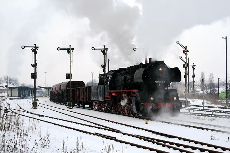 Während eines Plandampfes 1992 um Halberstadt, hält die 50 3708-0 auf dem idyllischen Bahnhof Badersleben mit ihrem Zug aus Richtung Dedeleben.